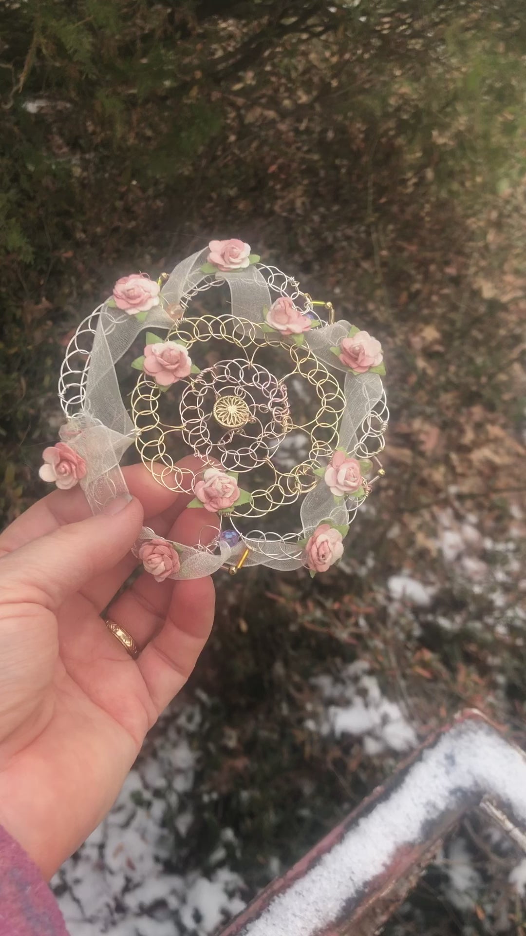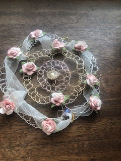 Dreaming of brighter times? Of beauty? Simple pleasures? You'll love the nostalgic, cottage core appeal of this lightweight, rose gold and gold wire kippah with its sheer ribbon and sewn on flowers. Wear it to synagogue, zoom schul, or even Holiday events, such as Hanukkah or Interfaith assemblies, or decorate an empty wall by adding your own hook and wire! Features a gold -tone vintage button at the focal point and a breezy, translucent pinkish gold nylon ribbon. Please specify a comb, clip or both when ordering.